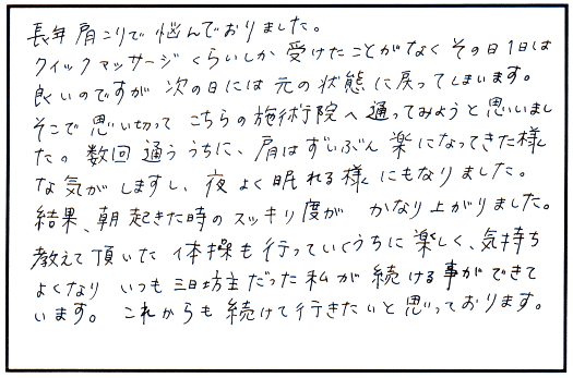 頭蓋仙骨療法やレイキヒーリングを主体に施術を受けていただき、自宅での体操、枕を代えてだんだん良くなっています。この調子でいきましょう。